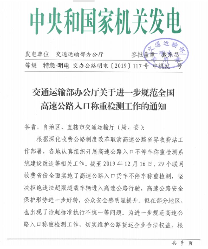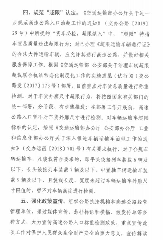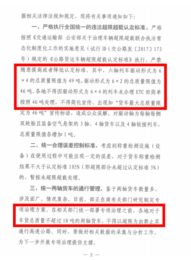 為進一步相應(yīng)國家關(guān)于收費公路制度改革取消高速公路省界收費站工作部署,近日,交通運輸部發(fā)文《交通運輸部辦公廳為進一步規(guī)范全國高速公路入口稱重檢測工作的通知》(以下簡稱“通知”),該通知重點強調(diào)了全國統(tǒng)一的違法超限超載認定執(zhí)行標準,并進一步明確“六軸列車驅(qū)動形式為6*4的總質(zhì)量限值為49噸,驅(qū)動形式為6*2的總質(zhì)量限值為46噸。各地不得因驅(qū)動形式為6*4的列車未辦理ETC而簡單按照46噸處理,不得簡化宣傳,出現(xiàn)如“貨車最大總質(zhì)量限定為46噸”宣傳標語,造成公眾誤解。”;同時還要求,各地對于車貨總重不超過18噸的兩軸貨車,不得以超限為由禁止其通行高速公路。